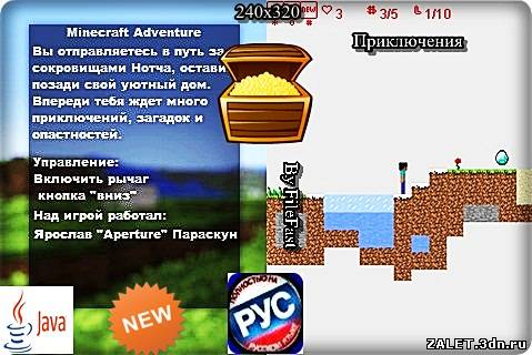 Ты выходишь из своего домика для поиска сокровищ Нотча, убивая по дороге монстров, разгадывая головоломки. Всего в java-игре 8-ь увлекательных уровней. Чтобы пройти в тебе необходимо не только собрать все алмазы, но и остаться в живых.